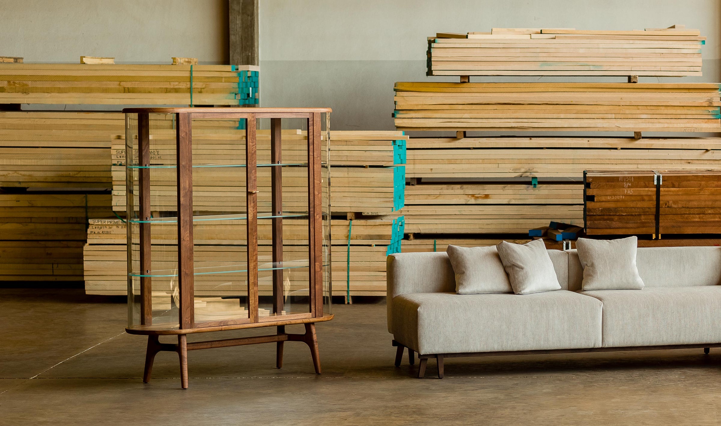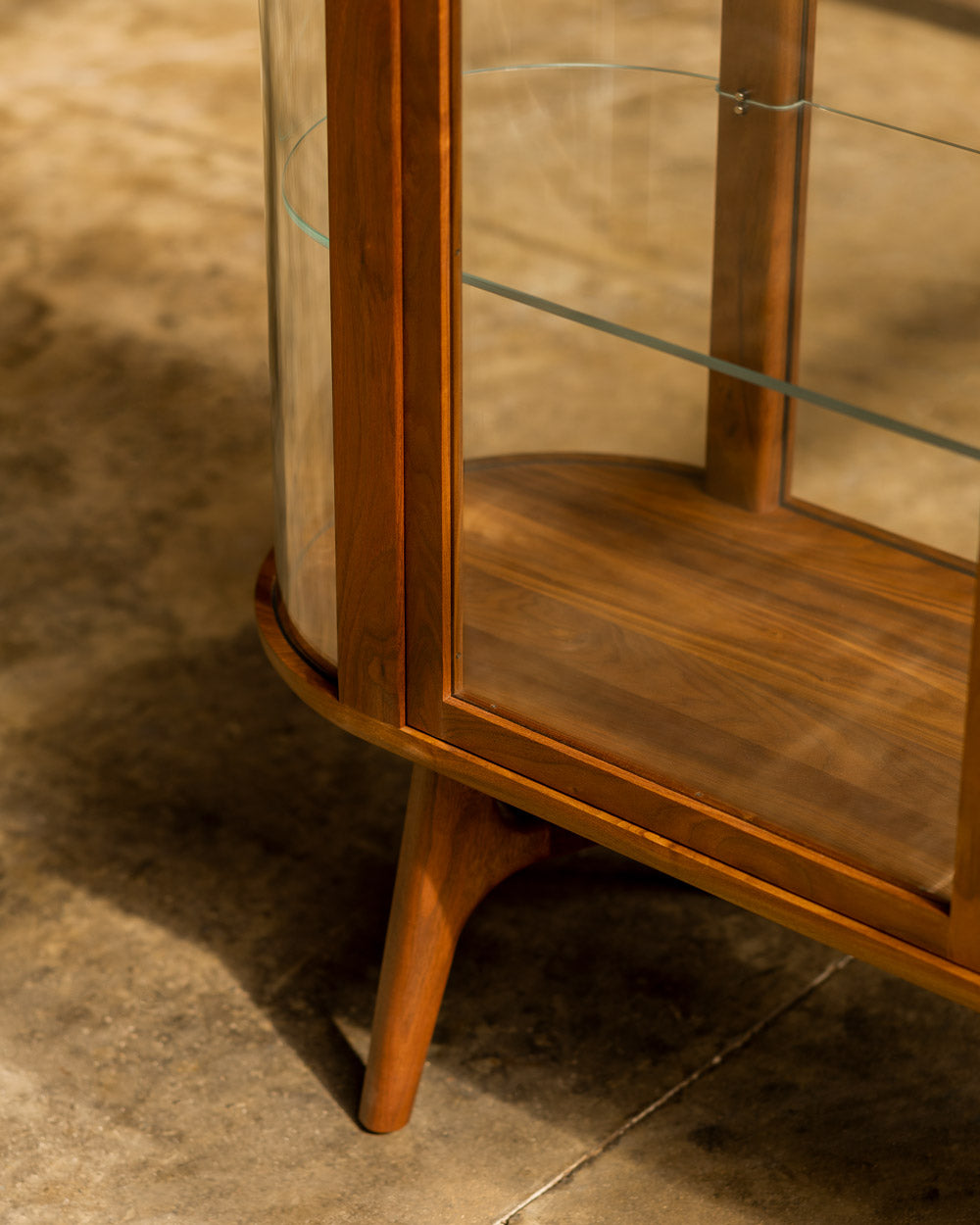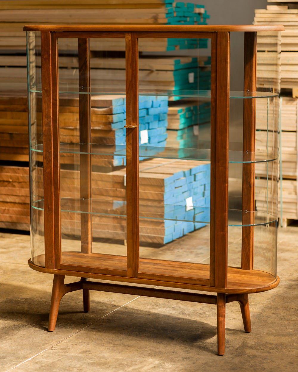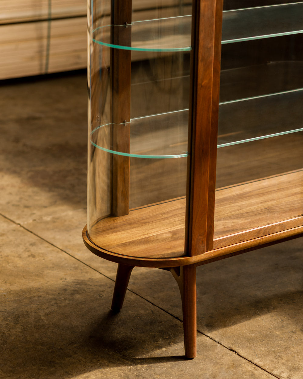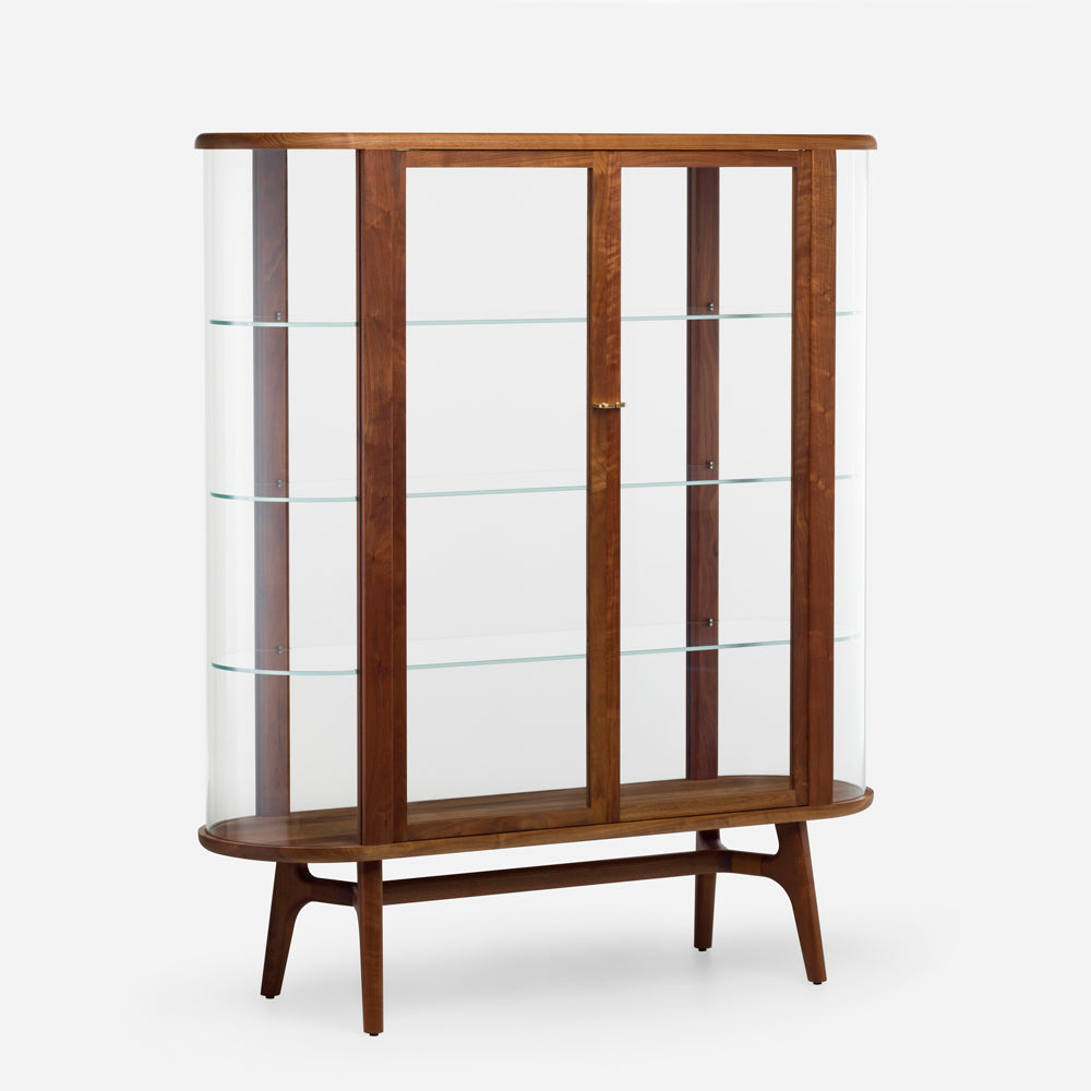 Solo Tall Vitrine, part of the Solo Series, reflects the same warm modern aesthetic, thoughtful functionality, soft curved edges, and beautiful detailing of the rest of the series. The expansive dimensions of the unit, combined with large areas of clear glass and even clear glass as shelves, create an impressive display where the objects within are the main visual highlight. Detailed with machined brass handles.