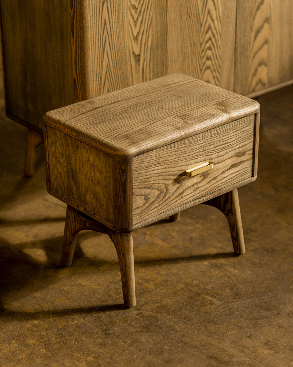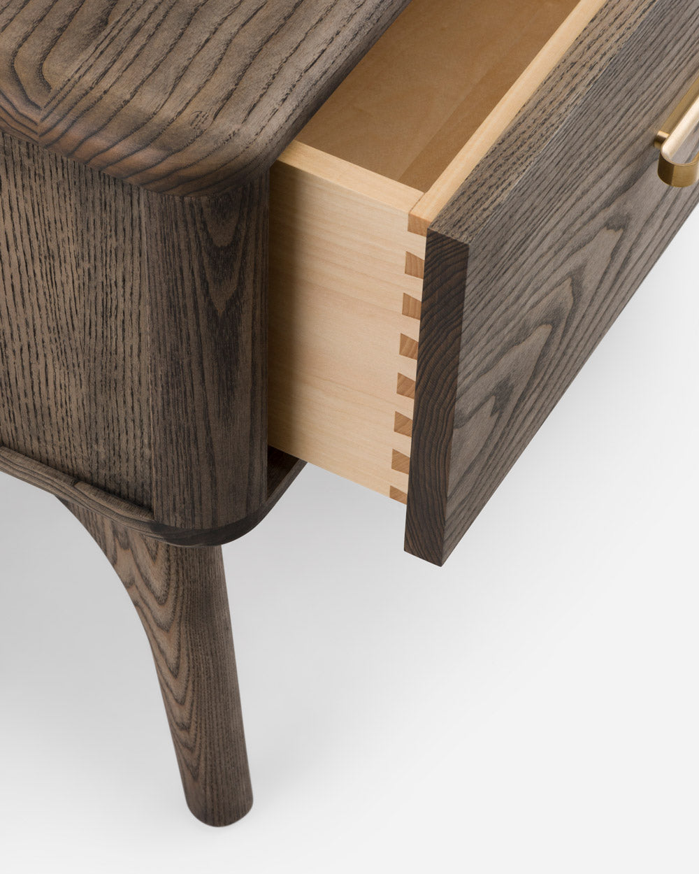 Solo Bedside Chest offers generous bedside storage with a small footprint. The solid wood unit features a machined brass handle, an elegant leg frame, and a single soft-close storage drawer detailed with dovetail joinery.