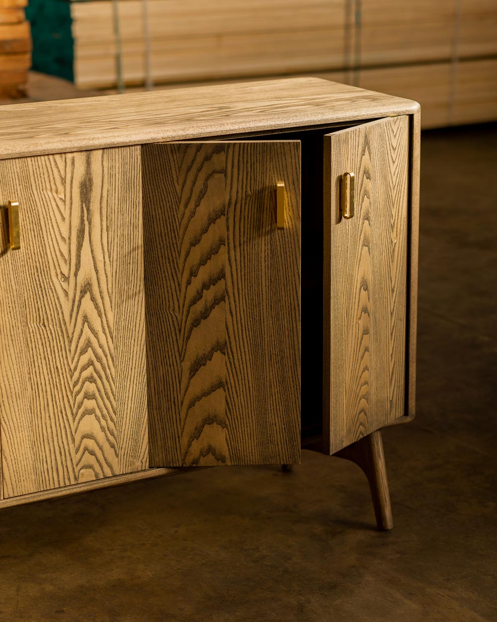 The solid wood cabinets, now available in three sizes, feature machined brass handles and an elegant leg frame. Organisation is optimised with cable management, adjustable internal shelving, and optional internal storage trays, available separately, that connect to the shelves with hidden magnets.